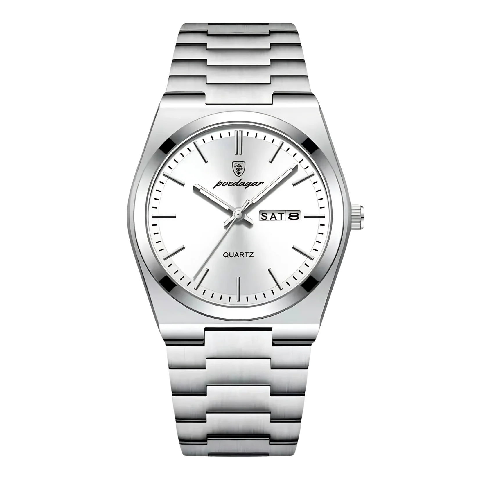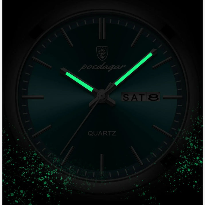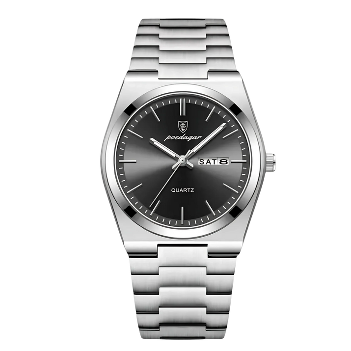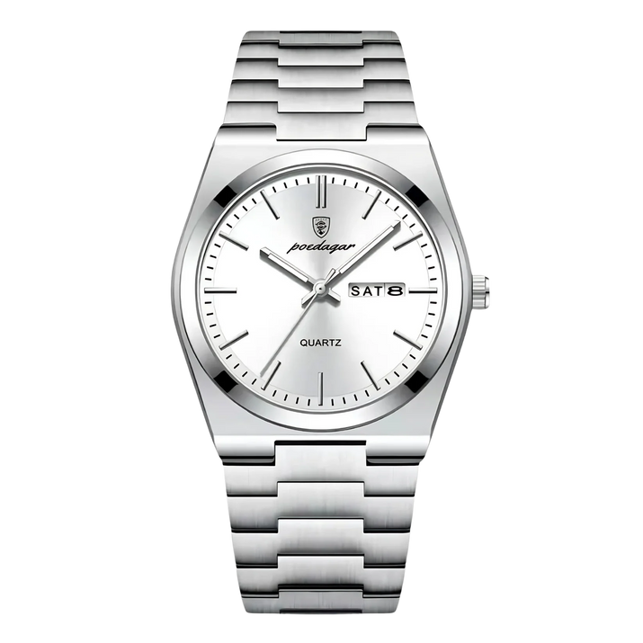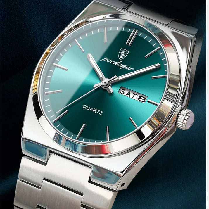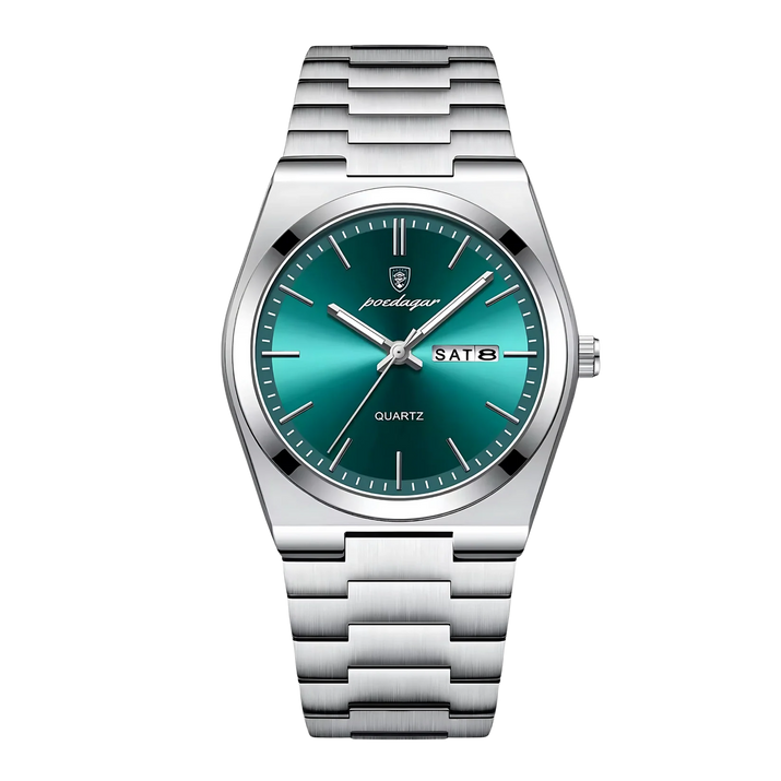 Antwoord 1: Dit horloge heeft een sportief en elegant design, met lichtgevende wijzers en cijfers, een multifunctioneel display voor dag, datum en week, en is volledig gemaakt van roestvrij staal. Het is ook waterbestendig, waardoor het geschikt is voor dagelijks gebruik en avonturen.